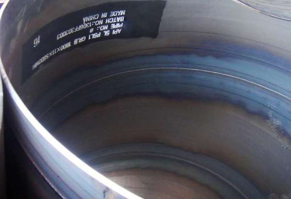 钢管上允许有钢带对头焊缝,钢带对头焊缝与管端的距离不得小于300mm。经购方与制造厂协商,允许钢带对头焊缝位于管端,但钢带对头焊缝与相应管端螺旋焊缝之间至少应有150mm的环向间隔。钢带对头焊缝应采用埋弧焊法焊接,内外埋弧焊缝各不少于一道。允许将钢带对头焊缝的余高铣去,但铣削处或焊缝原始表面不得低子母材表面